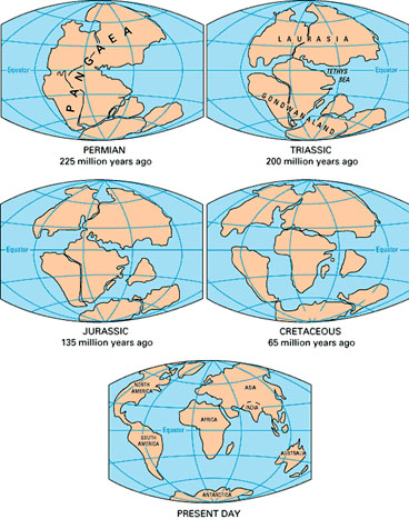 Kira-kira 250 juta tahun yang lalu sebagian besar kerak benua di Bumi merupakan satu massa daratan yang dikenal sebagai Pangea. Kemudian, kira-kira dua ratus juta tahun yang lalu selama Periode Trias, Pangea terpecah menjadi dua benua besar yaitu Laurasia, yang sekarang terdiri dari Amerika Utara, Eropa, sebagian Asia Tengah dan Asia Timur; dan Gondwana yang terdiri dari Amerika Selatan, Afrika, India, Australia dan bagian Asia lainnya. Bagian-bagian dan dua benua besar ini kemudian terpecah-pecah, hanyut dan bertubrukan dengan bagian lain.