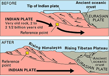 Bila dua buah Lapisan saling bertubrukan maka salah satu lapisan akan terangkat dan membentuk pegunungan. Pegunungan Himalaya dengan puncak Gunung Everestnya mulai terbentuk 60 juta tahun yang lalu, ketika lapisan Bumi yang mengangkut India bertabrakan dengan lapisan Bumi yang mengangkut Eurasia.